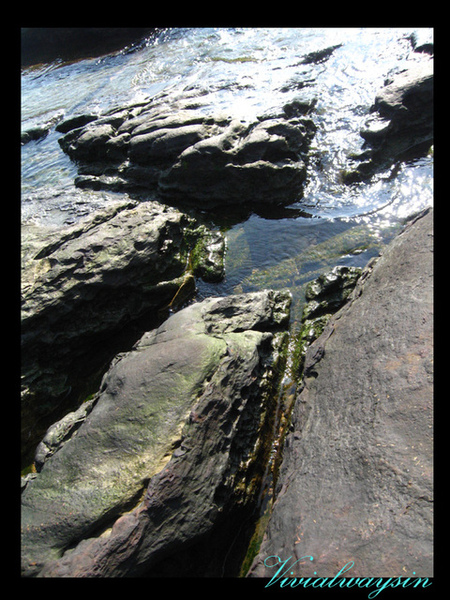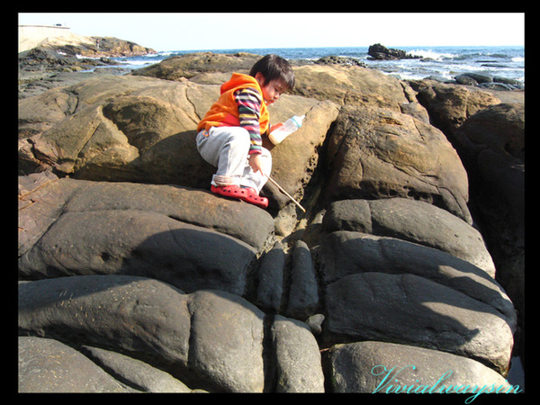 小寶好忙,在豆腐岩上跑來跑去,拿著他的小棒棒打水,還要把早餐的豆漿喝完。
