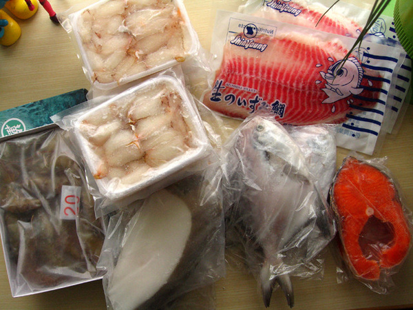 星期三的時後,收到了南部的大貓寄來的聖誕禮盒,大貓本來想找我試吃,可是我不希望她太破費,所以我訂了家裡常買的蟹腳肉,大貓很慷慨的寄上了她家招牌魚貨,有鮭魚、鯧魚、鱈魚、鯛魚,還有大白蝦。