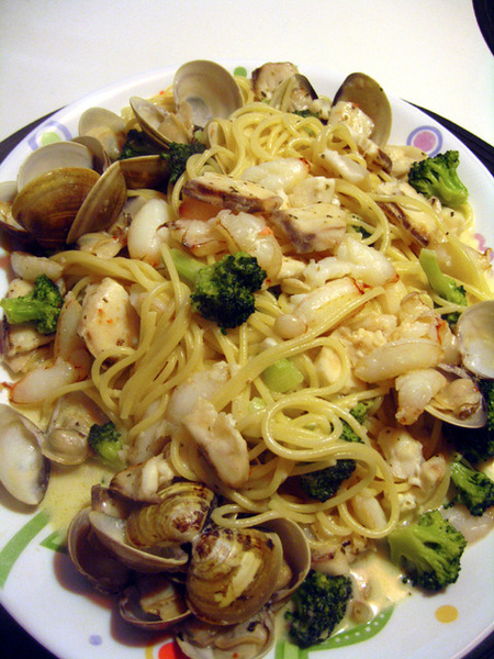 重點是白醬海鮮義大利麵,這麼大一盤也沒得剩,四大一小的胃口還真好,其實應該算三大,因為我只吃了一小搓,比小寶還小碗。