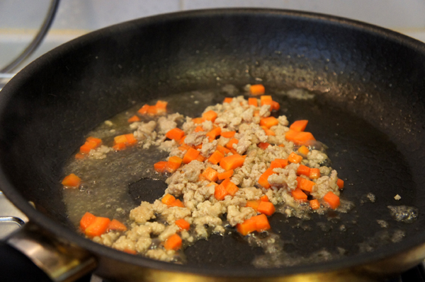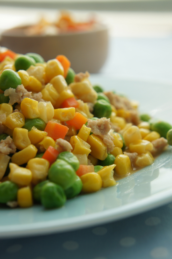 當然,低GI飲食會是一個指標,只是低GI飲食的東西,小孩能接受的就沒那麼多樣了。先從第一天開始,炒個小孩愛吃的玉米肉末來做起。刻意加了胡蘿蔔,用了一湯匙橄欖油炒。一湯匙的油會有大約60卡左右,但胡蘿蔔一定要有油。絞肉用小里肌繳,比較瘦一點。加些水,就可以讓胡蘿蔔快軟,又不用那麼油了。之後加進豌豆跟小罐的綠巨人就行了,簡單加些海鹽調味即可。