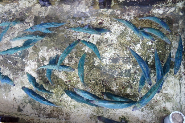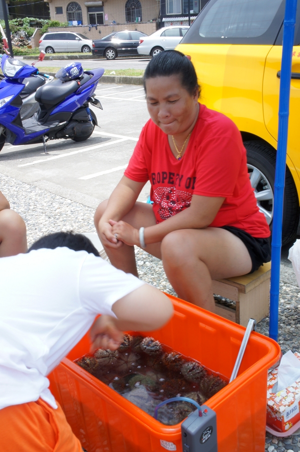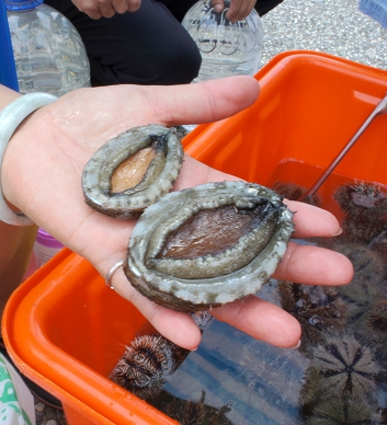 還有野生的九孔。小朋友圍著這兩個置物箱,簡直像是到了海生館吧, 對於都市小孩來說,也算是難得海洋生態體驗。
