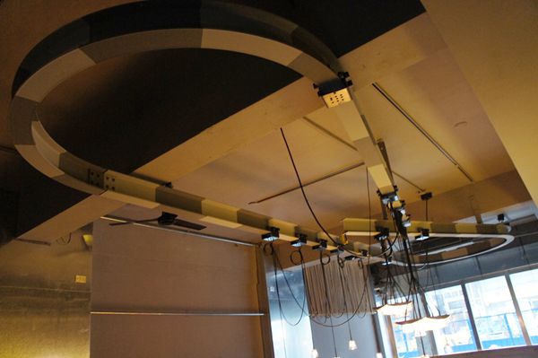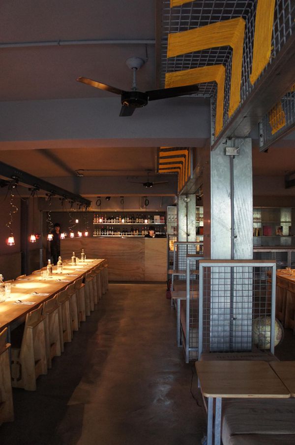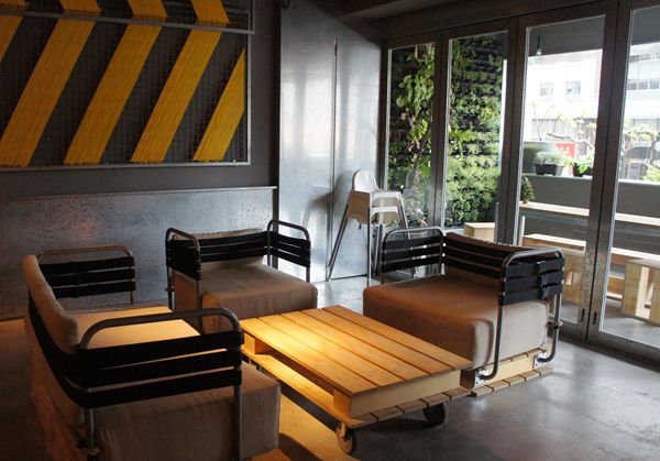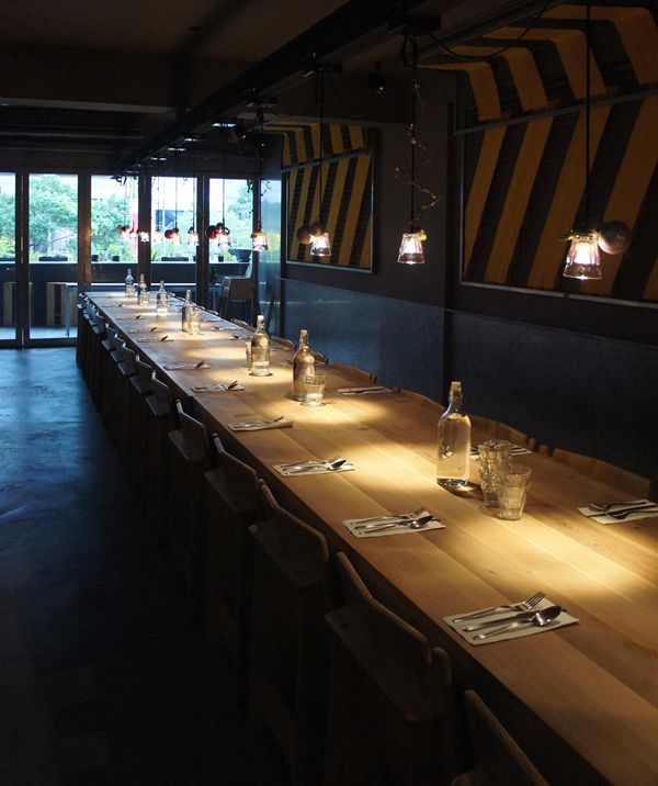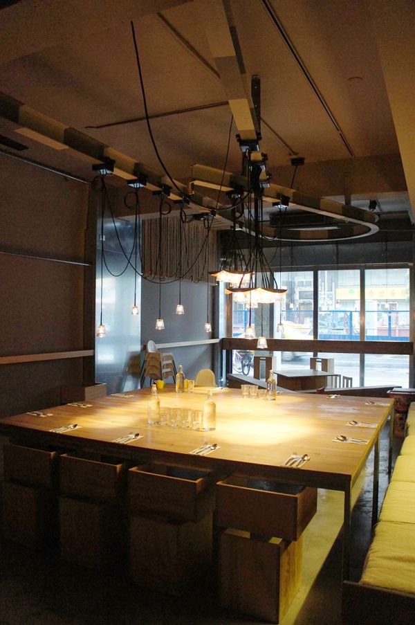 我們上了2樓,感覺像是紐約蘇活區的肉品工廠改裝的感覺。簡約、時尚、工業。警示用的黃黑相間的條紋元素也用了進來。大型的長條木桌,看起來好舒服的感覺。