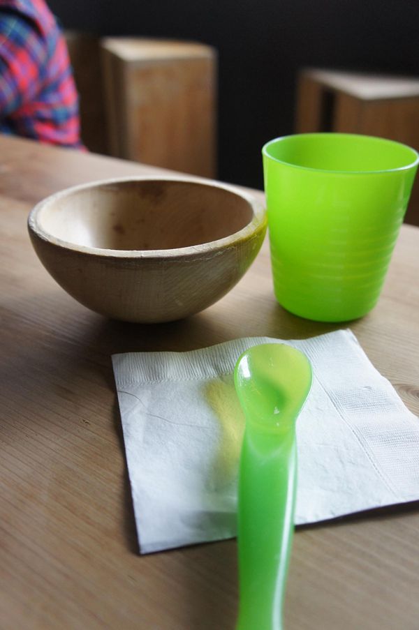 小朋友可以選擇小朋友餐具,很棒的是使用的是木碗,而不是整套塑膠或美耐皿。