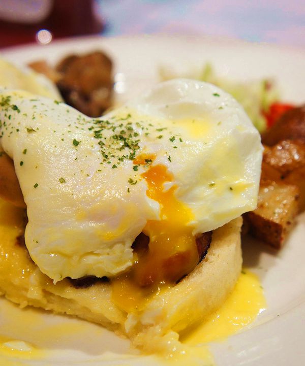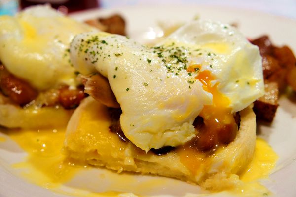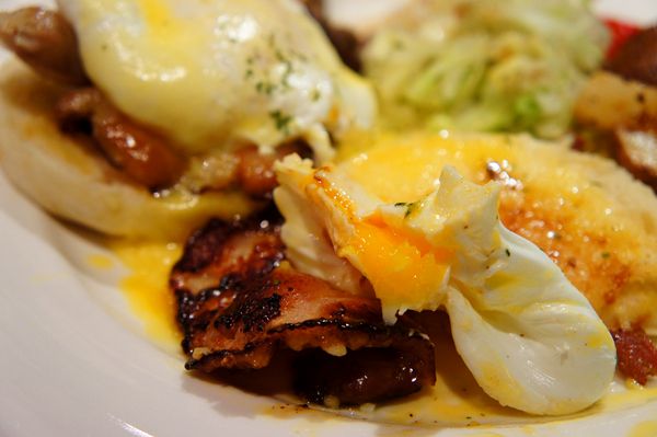 我點的是班尼迪克蛋,元旦當然要吃蛋啦。兩顆半熟蛋,放在馬芬麵包上,還加了德國香腸跟培根。