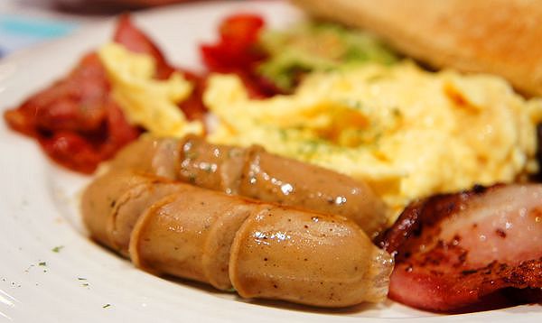 朋友點的香腸培根土司也上桌了。相當美式風格吃到油脂很爽快的早餐Style。