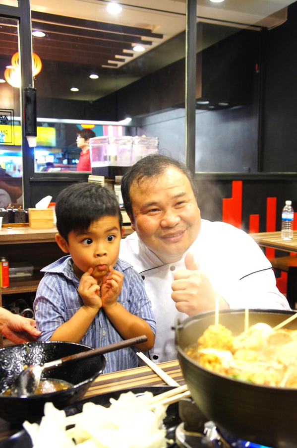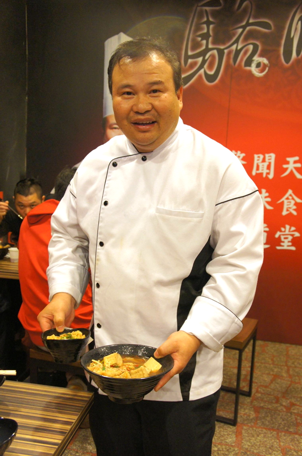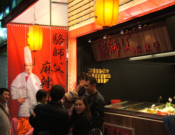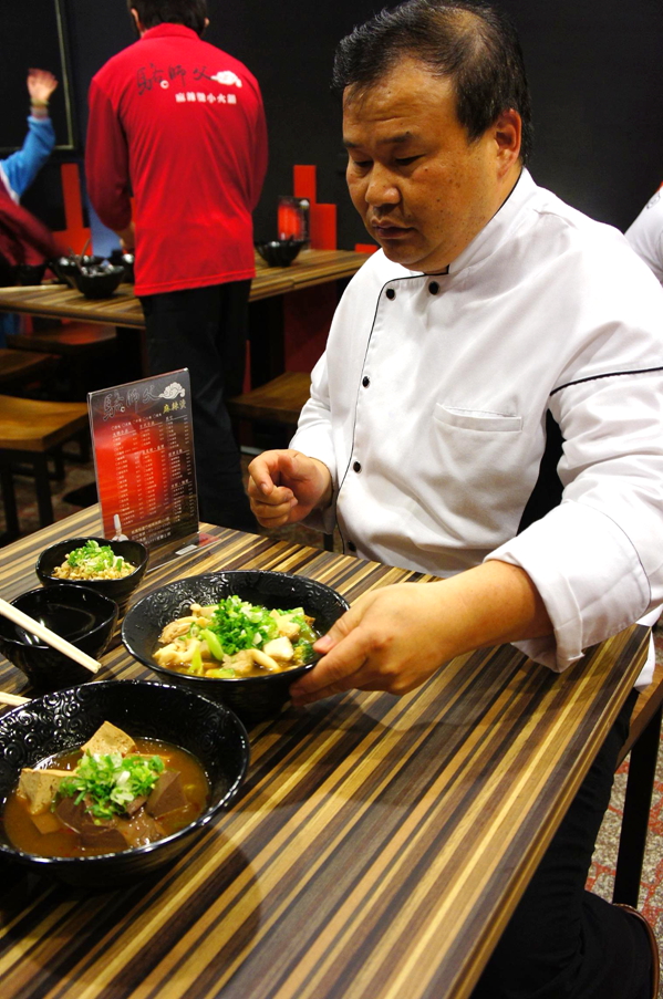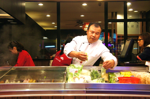 我們一走進去,沒想到就見到駱師傅笑呵呵的幫客人端起剛做好的麻辣燙了~~嚇一跳哩