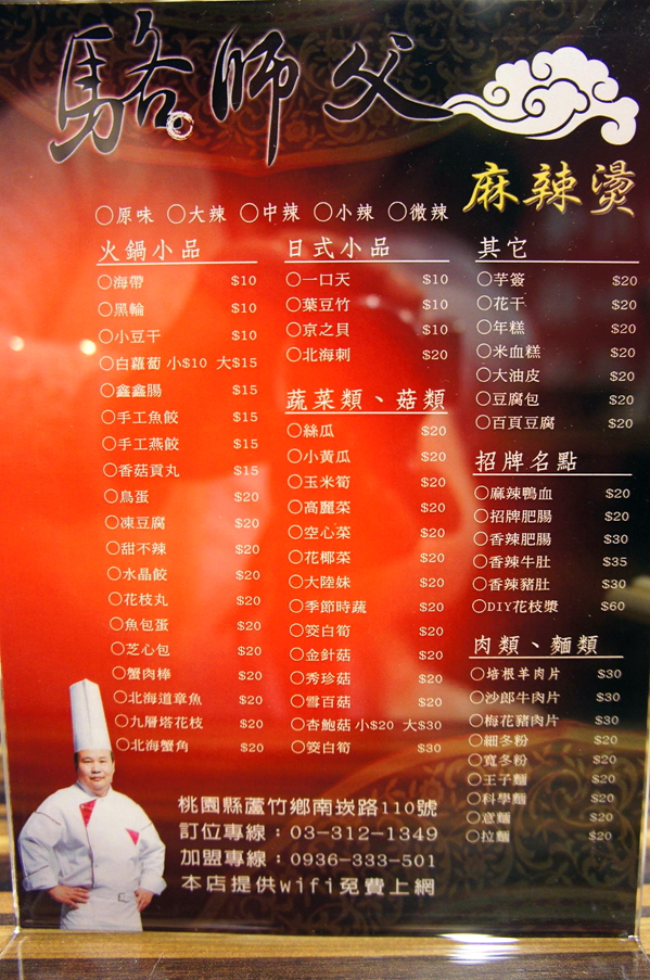 在冷藏櫃前面的牆上,看到這些牌子,麻辣湯底可以有4個辣度可以選擇。還有招牌的鴨血跟豆腐則是駱師傅推薦的必點菜色。