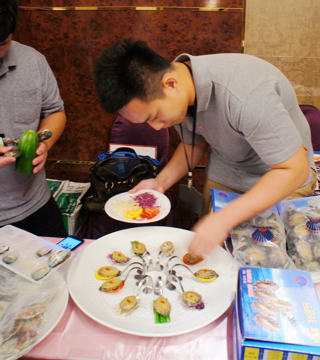 另外一邊的小鮑魚,也開始擺盤,這家是水蛙師的奇真會館,來展示小鮑魚。