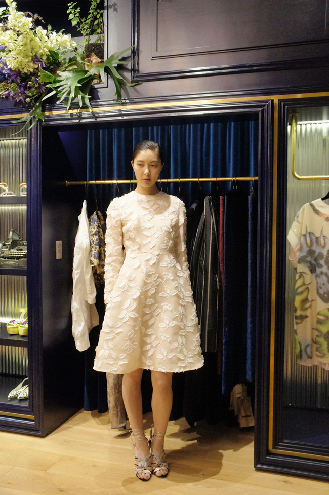 喔,白色這件我喜歡。粉白色一件式澎裙洋裝,上面是立體的葉片,端莊優雅又帶點大自然的感覺。