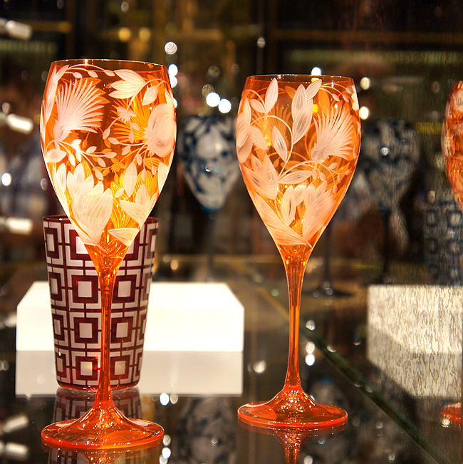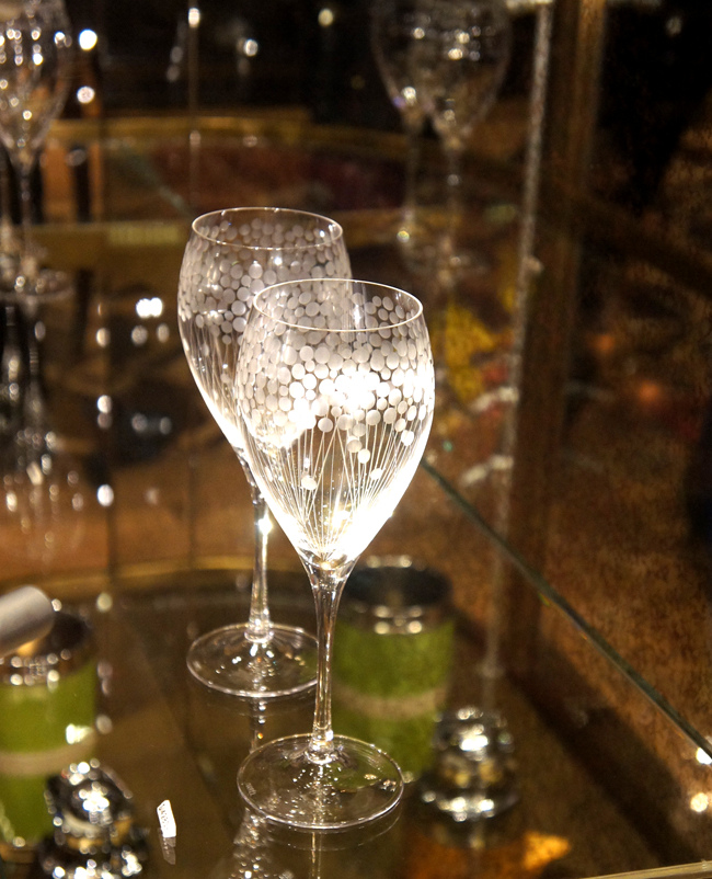 玻璃櫃中還有許多的進口水晶玻璃杯跟酒杯,細膩的雕工可以感受到歐式的水晶雕刻工藝之美。