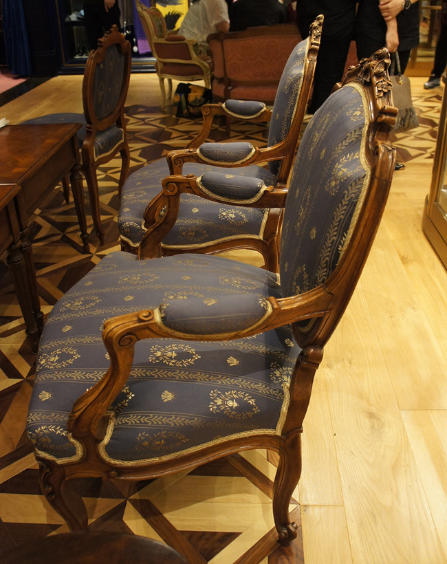 我特別喜歡這款藍灰鑲金的椅布,襯著木頭雕刻的椅子,分外好看。